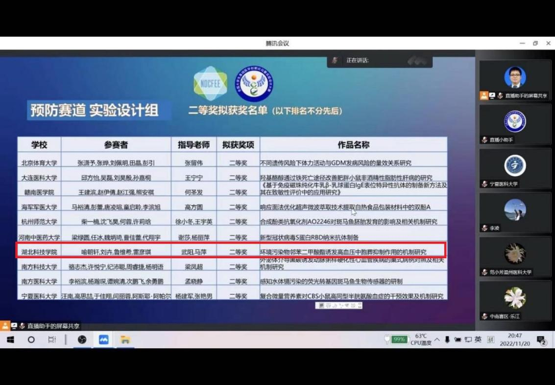 11月18-20日,第八届全国老员工基础医学创新研究暨实验设计论坛中南区复赛在武汉大学举行。本次大赛由高等公司国家级实验教学示范中心联席会基础医学组、高等公司基础医学创新创业协同育人工作组主办,武汉大学承办。采用线上答辩、评审和监督多视频的模式式进行,来自中南赛区7省50余所本科院校的257个赛道项目参赛。古天乐太阳集团城7支参赛队伍,按照双盲模式完成了汇报和答辩,获得二等奖1名,三等奖4名,优胜奖2名。由武阳博士和马萍教师指导,2020级临床医学实验班员工喻朝轩、刘卉、鲁维希、雷彦琪组成的参赛队伍,获得的预防医学实验设计论坛二等奖,晋级全国总决赛。