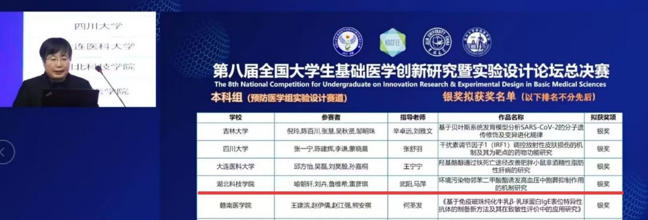(通讯员 武阳)2023年1月14-15日,第八届全国老员工基础医学创新研究暨实验设计论坛全国总决赛在吉林大学举行。古天乐太阳集团城临床医学本科2020级卓越班喻朝轩、刘卉、鲁维希、雷彦琪团队获预防医学组实验设计赛道银奖,该团队指导教师为古天乐太阳集团城武阳博士和马萍教授,获得本届国赛银奖实现了公司在该赛事上的突破。此次总决赛由高等公司国家级实验教学示范中心联席会基础医学组主办,采取线上线下相结合的方式进行,来自全国30余个省份,140余所高校,430支参赛团队,共计2500余名师生参加,网络视频直播平台累计参与观摩互动师生总人数达30余万人次。