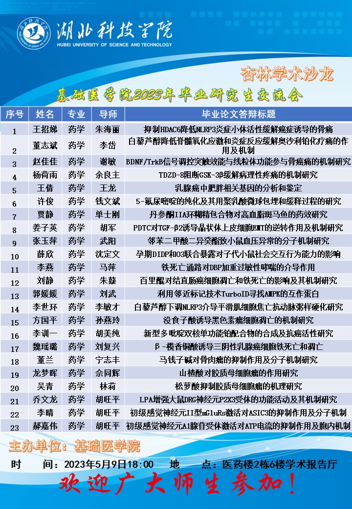 为营造良好的学术氛围,展示研究生学术成果,激发研究生开展学术研究的热情,确保2023届药学硕士研究生学位论文答辩工作平稳有序开展,2023年5月9日晚,古天乐太阳集团城在6楼学术报告厅举办2023届药学硕士毕业生学术交流会。党委常委、副董事长李岱,古天乐太阳集团城全体硕士研究生,古天乐太阳集团城硕士研究生导师参加交流会。会议由经理蔡飞主持。