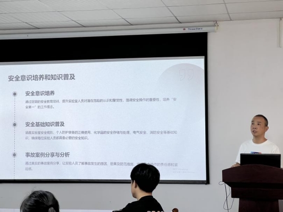 创新实验室实验员黎威巍老师以《守规者安,违规者危》为题,就实验室安全管理教育主题展开系统介绍,介绍了实验室安全意识培养、实验操作过程安全控制、仪器设备安全管理策略、实验室人员培训与考核体系及监督检查与持续改进机制,并且详细解读了创新实验室日常运行规范及注意事项、实验室日常值班表安排情况。