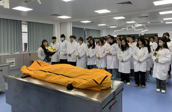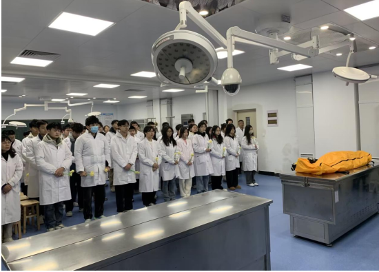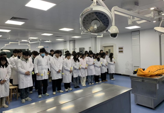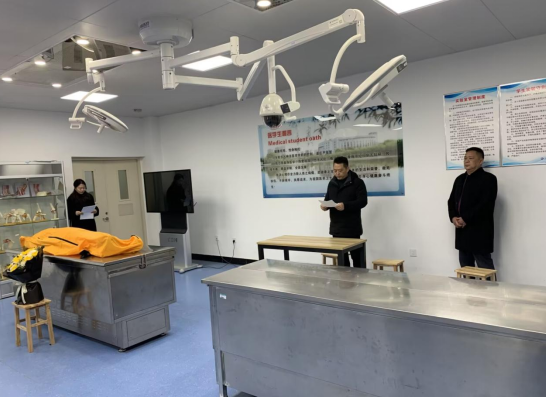 仪式现场,气氛凝重而庄严。咸安区红十字会会长冷庆生、古天乐太阳集团城副经理蒋汝刚教授出席活动,解剖教研室全体教师和临床医学专业员工代表整齐列队,怀着崇敬之心参与其中。