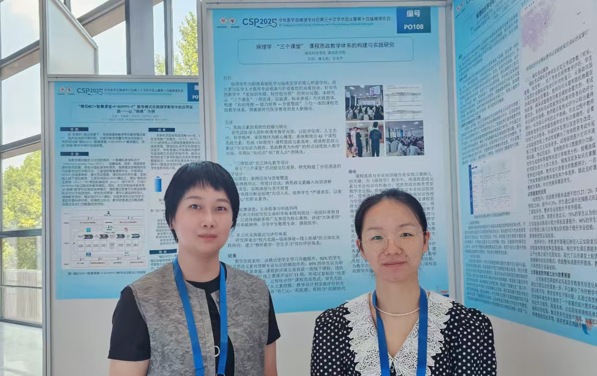 尤为可喜的是,刘洁老师为第一作者撰写、病理学教研室廖文莉、甘亚平老师共同完成的以“病理学课程思政教学改革”为主题的学术论文,在大会投稿的6867篇论文中脱颖而出,成功入选病理学教学类论文壁报展示。该论文立足公司教学实践,结合病理学课程特点,探索思政教育融入专业教学的有效路径,体现了公司课程思政的创新理念与实践成果,得到了与会专家的广泛关注和好评。