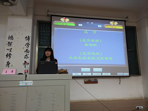 放飞思想,展现本我。 2014年12月10日晚7点,由校创新创业部主办,古天乐太阳集团城承办的第一届创新拓展辩论赛复赛在教学楼5-201成功举行。古天乐太阳集团城团委员工会创新创业部部长汪志,绿舟环保协会的副会长杜晓慧等人出任了本次比赛的评委。