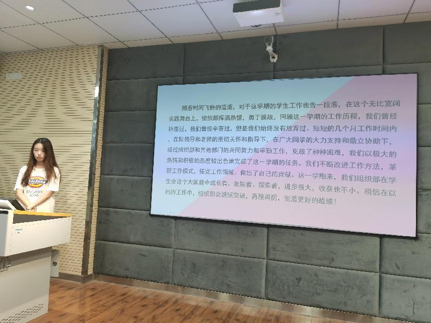 随后,主席沈桓宇对主席团工作作出述职报告。他提出员工会的运行不是由一个人两个人的力量,而是由各成员的力量凝聚在一起给予员工会运行动力,以“全心全意为同学服务”的理念开展各个活动,以积极认真的心态为同学们服务。携手并进,为建设团结、严谨、高效的员工组织而砥砺奋进。