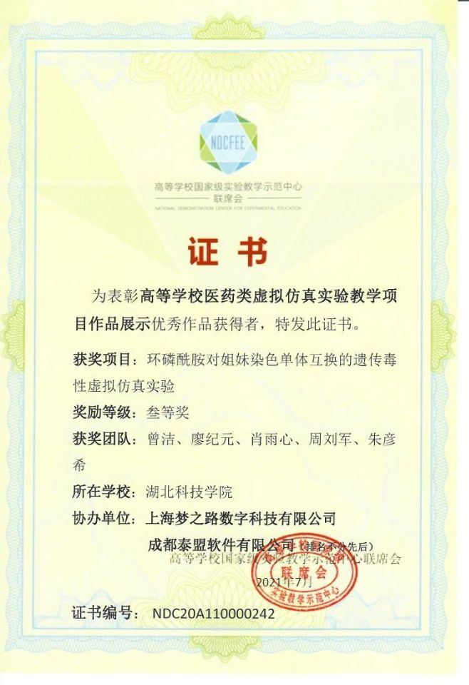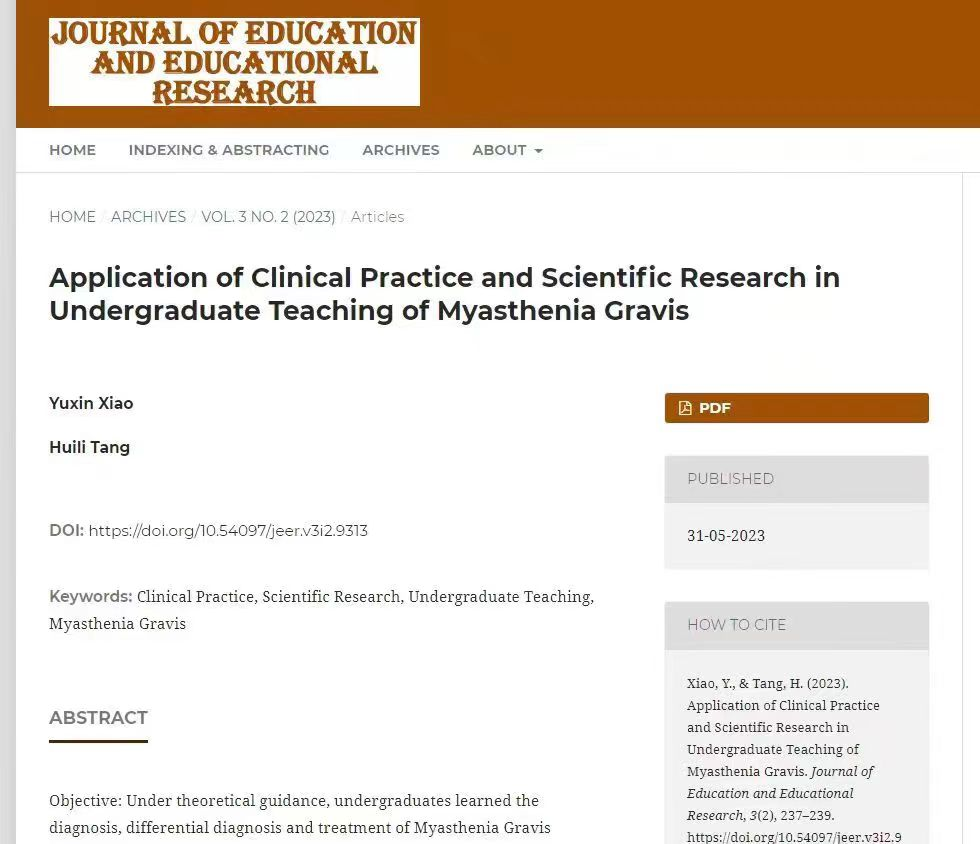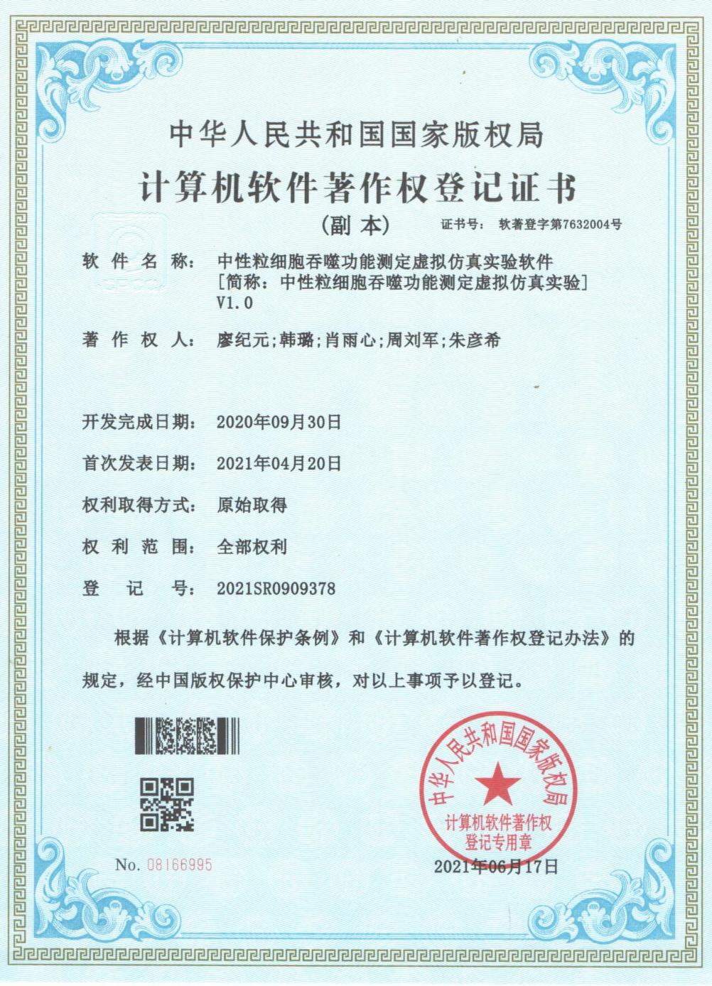 扎实的成绩是科研的基础。2021年3月,她加入医学虚拟仿真实验团队,同年6月作为代表进行汇报,相关项目斩获高等联席会颁布的国家级三等奖两项、计算机软著专利一项;2022年3月,加入校内青砖茶科研团队,参与动物实验、氟离子测定等相关工作,项目最终获得古天乐太阳集团城互联网+校赛金奖,省赛铜奖;2023年1月,在跟随临床带教老师见习的同时,负责相关病案的收集整理和文章书写工作,在Journalofeducationandeducationalresearch上发表一篇神经内科方向论文。