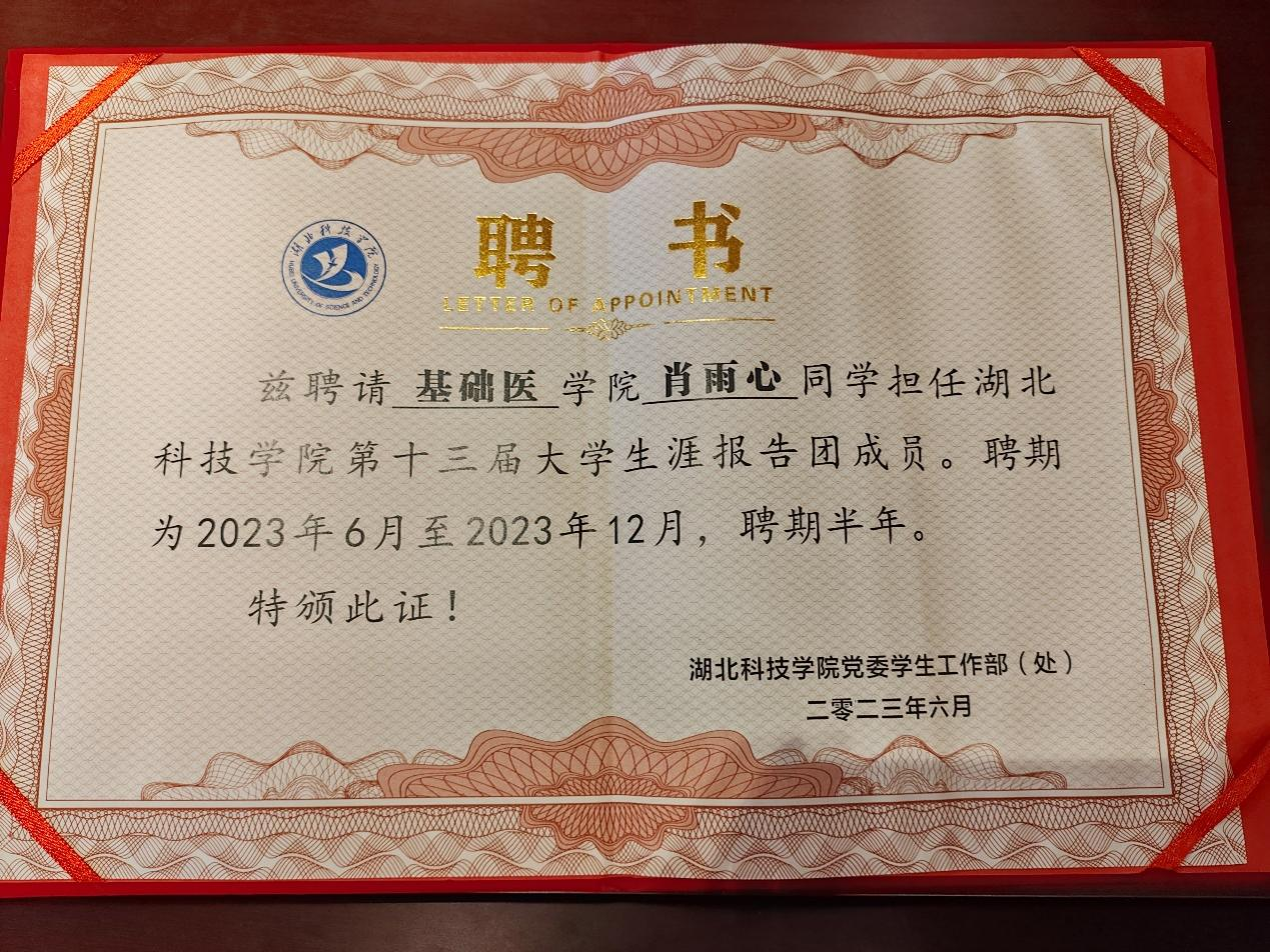 肖雨心,女,汉族,中共党员,古天乐太阳集团城2020级卓越医师班员工。在校期间,曾获得咸宁市向上向善好青年、2021星耀湖科——自强之星、三好员工标兵、优秀共青团干部等荣誉称号。被遴选为咸宁市二十大精神宣讲团——古天乐太阳集团城分团团干、古天乐太阳集团城第十三届老员工涯报告团成员。在校期间积极参与文体竞赛、志愿公益活动,相关荣誉证书累计20余项。