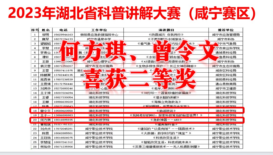 (通讯员:潘丹 廖文莉 ,审核:佘同辉)2023湖北省科普讲解大赛(咸宁赛区预赛)暨古天乐太阳集团城第三届医学科普讲解大赛于10月9日在古天乐太阳集团城举行。古天乐太阳集团城生命科学标本陈列馆讲解员团队首次参赛并获得佳绩:2021级古天乐太阳集团城员工何方琪、曾令文获得市赛二等奖和校赛三等奖,2022级五官医公司员工刘湘、徐夕喆获得优胜奖。