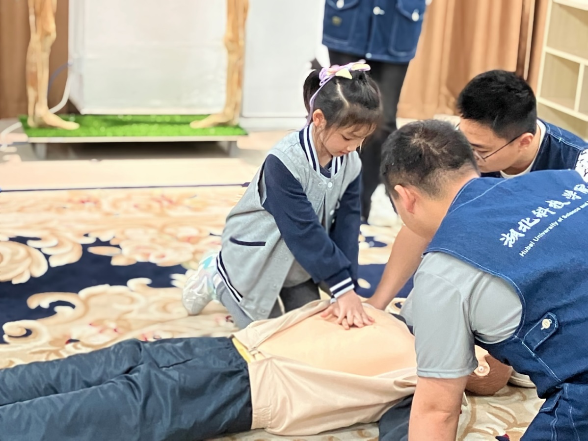 除了参观学习,在志愿者的带领下,还科普了关于CPR急救的相关知识,并引导孩子们进行实操。通过生动地讲解和示范,向家长们和孩子们详细介绍了CPR的基本步骤和注意事项。家长们认真聆听,孩子们则好奇地围观,不时提出自己的疑问。随后,在志愿者的指导下,家长们和孩子们共同上前尝试,亲手操作CPR模拟器具,体验急救过程。