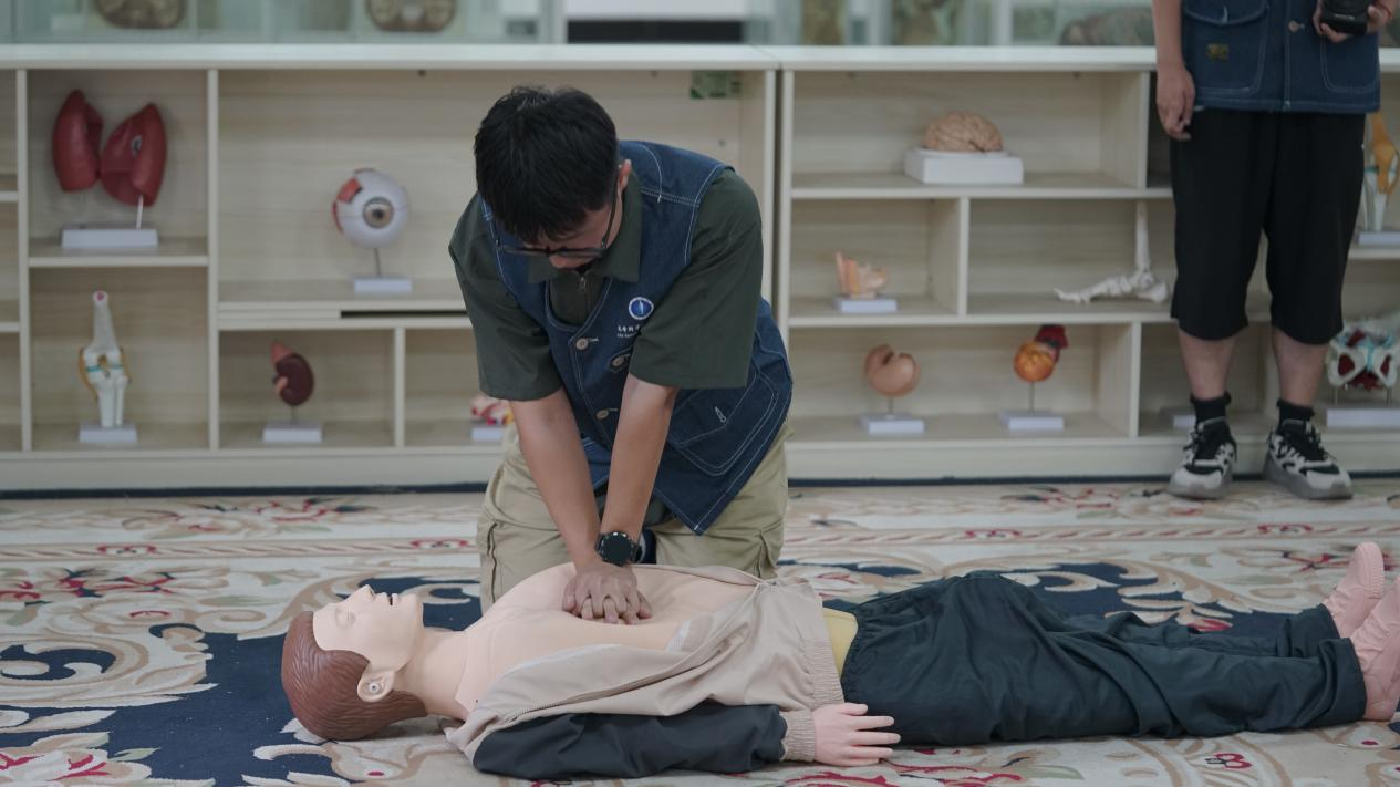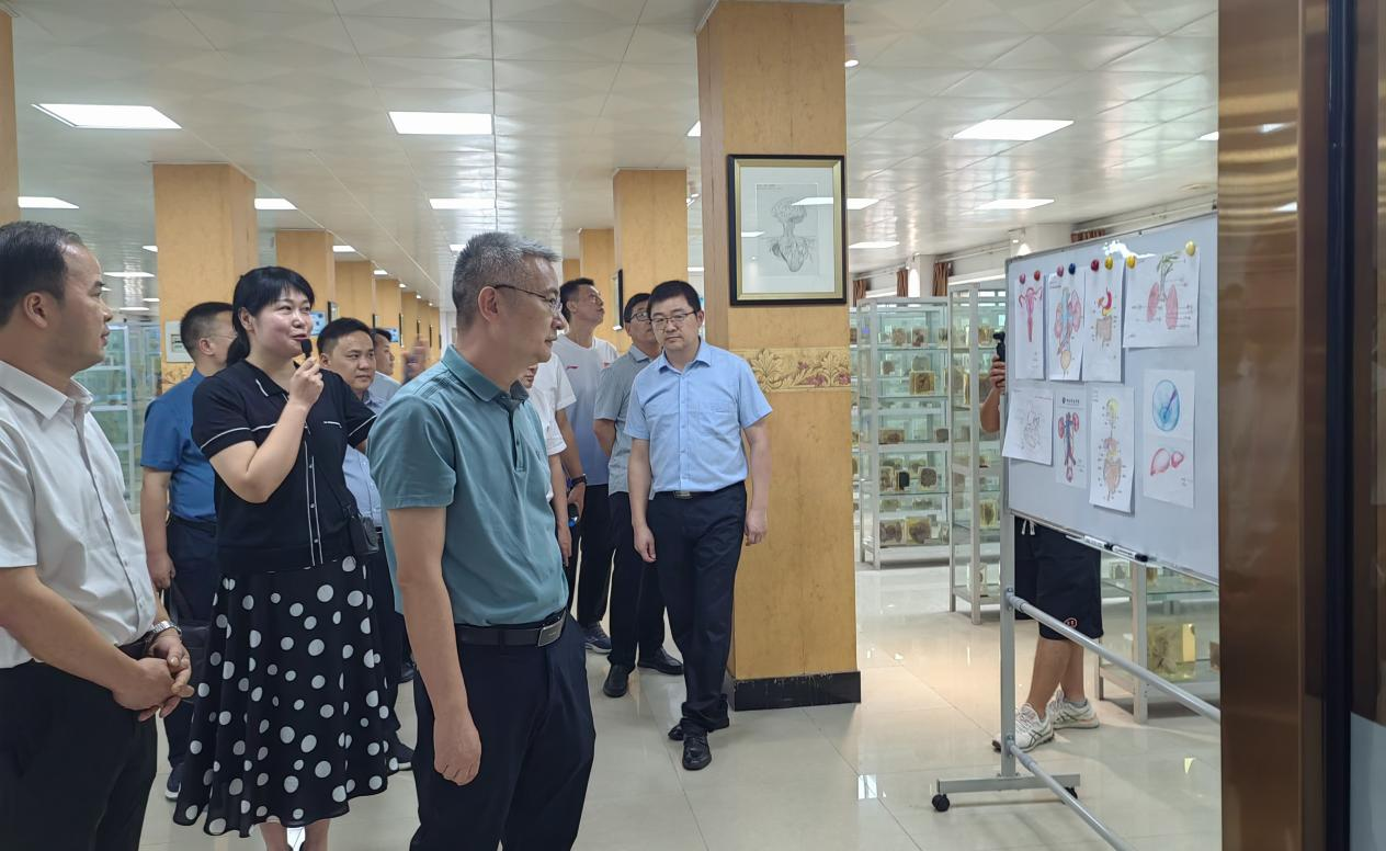 标本馆馆长廖文莉引导盛明科董事长一行深入了解了标本馆的发展历程、特色收藏,以及其作为省级科普教育基地和大思政实践基地在人才培养、服务社会等方面承担的重要角色;参观过程中,员工志愿者还进行了海姆立克急救法、CPR心肺复苏急救技能的现场演示,凸显了科普教育在培养实用技能方面的有益作用;此外,VR系统让大家更加直观地认识了生命科学,而员工自主创作的医学可视化作品则展示了跨专业合作的成果、传递了医艺双馨的教育理念。盛董事长一行高度赞扬了标本馆的馆建特色及育人成绩。
