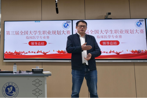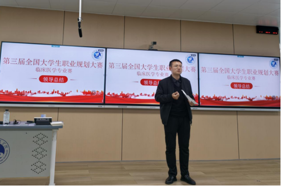 比赛最后,佘同辉作总结讲话。他强调职业规划不是空洞的口号,而是从职业认知到路径设计的完整闭环,其关键在于明确目标与树立理想。他鼓励同学们珍惜大学时光,尽早确立职业目标,将个人理想融入医学事业发展。针对大赛设置的两大赛道,他特别指出,成长赛道要以职业目标为导向,脚踏实地付诸行动;就业赛道要精准锚定求职方向,在学习与思考中锤炼本领,最终实现职业理想。他希望全体医员工以此次大赛为契机,不断夯实专业基础、锤炼综合素养,在医学道路上稳步前行,用扎实的专业能力与坚定的职业信念,书写医者仁心的精彩篇章。