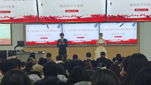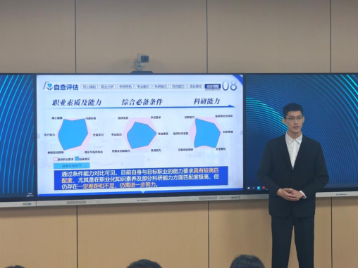 在自我评估环节,选手们结合自身性格特质、专业成绩与学习实践经历,精准分析个人与目标职业的匹配度,展现了当代医员工清晰的自我认知。唐永松同学以“一以贯之,迈向未来”为主题,将个人职业规划与国家医疗战略需求紧密结合,从基层医疗服务缺口分析、个人医学素养提升路径、阶段性学习计划制定、科研能力培养方向等多个维度,系统阐述了自己的职业发展思路。此外,其他选手也通过分享专业课学习成果、学科竞赛经历、科研项目参与过程、临床实习感悟及志愿服务故事,全方位展示了在专业技能、沟通协调、应急应变等方面的综合能力,充分彰显了医员工的青春风采,赢得评委与观众的一致认可。