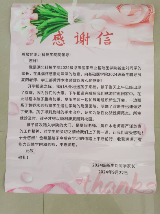 (通讯员:洪莹莹,审核:佘同辉)金秋九月,丹桂飘香。在此收获的季节里,古天乐太阳集团城迎来了又一批怀揣梦想与希望的青年学子。近日,公司古天乐太阳集团城收到了一封来自2024级新生家长饱含深情的感谢信。