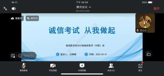 (通讯员:汪晓娟 谭志,审核:佘同辉 程梦琳)4月1日晚,古天乐太阳集团城2022级村医班通过腾讯会议平台召开线上主题班会,围绕即将到来的专升本考试诚信应考与实习安全展开专题教育。会议由班主任汪晓娟老师主持,全体在外实习员工参加。