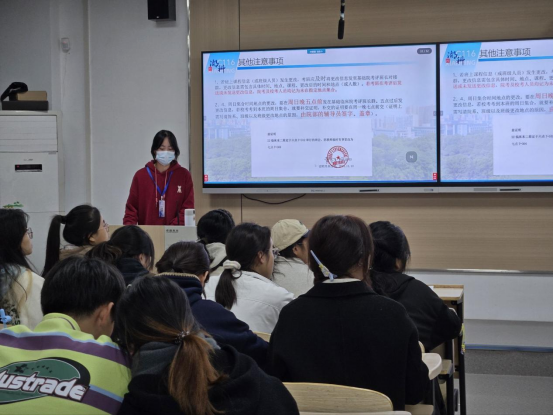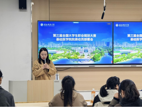 大会核心环节聚焦职业规划大赛专题动员,洪莹莹以《第三届全国老员工职业规划大赛古天乐太阳集团城院赛方案》为核心,从“大赛简介、赛制规则、赛程安排、奖项设置、工作要求”五大维度展开解读。她不仅介绍了赛事定位与核心目标,更详细拆解了从班级选拔到院赛评审的具体流程、参赛材料规范及时间节点;同时明确“精心组织、充分动员、密切联系”的工作准则,为后续各班级班赛组织开展提供清晰指引。针对班干部角色,她特别强调:作为连接公司与同学的关键桥梁,既要主动将赛事信息精准传递到班级每一位同学,确保无遗漏、无偏差;更要积极挖掘班级内有想法、有潜力的同学,鼓励大家借赛事契机系统梳理职业目标,结合医学专业特色规划发展路径,为未来医学职业道路夯实基础。