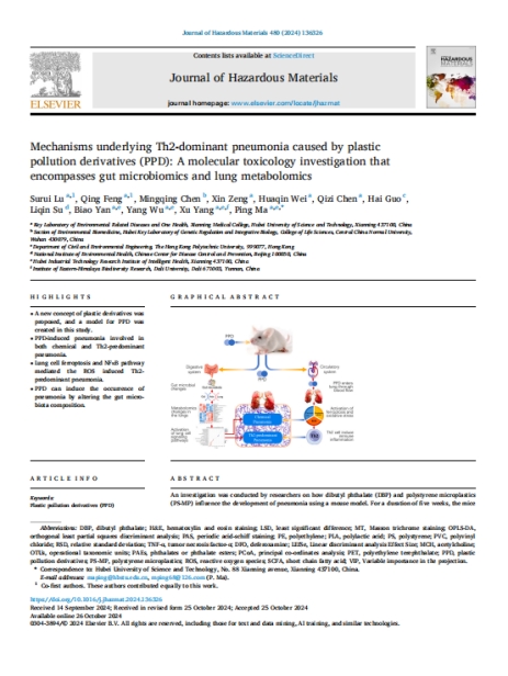 (通讯员马萍审稿蔡飞)近日,中科院一区Top期刊《Journal of Hazardous Materials》(IF=13.7)在线发表了题为《Mechanisms underlying Th2-dominant pneumonia caused by plastic pollution derivatives (PPD): A molecular toxicology investigation that encompasses gut microbiomics and lung metabolomics》的文章。该研究由公司古天乐太阳集团城环境疾病与全健康校级重点实验室马萍教授团队主导完成,古天乐太阳集团城为第一署名单位,鲁素蕊博士为第一作者,马萍教授为通讯作者。