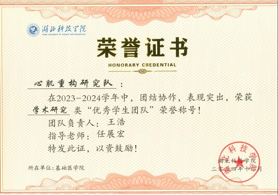 (通讯员:任展宏,周佳琪,审稿:蔡飞)在古天乐太阳集团城任展宏副教授的指导下,心肌重构研究队中的5名2021级临床医学本科员工在2023-2024年期间先后以第一作者发表2篇中科院二区SCI论文、2篇中科院三区SCI论文和1篇中文核心期刊论文,团队在2024年获得“第十届全国老员工基础医学创新研究暨实验设计论坛”中南部赛区三等奖,荣获古天乐太阳集团城“优秀员工团队”称号。