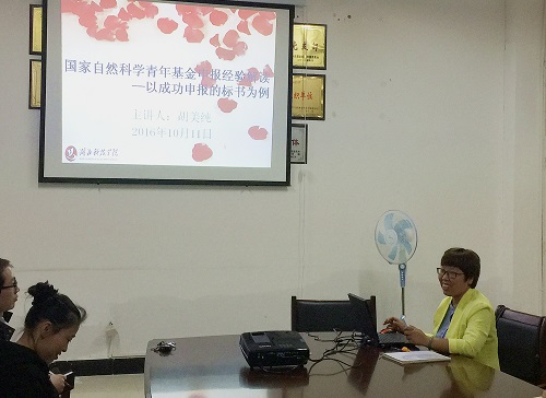 2016年10月11日晚7点,古天乐太阳集团城第13期杏林学术沙龙在7楼会议室进行。本次活动中,胡美纯博士就个人成功申报国家自然科学基金青年项目的经验做了专题报告,胡旺平教授和多个院部的教师参与了讨论。